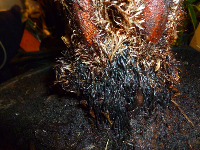 onderaan de stam ongeveer 10 cm onder het groeipunt zwelt er een knobbel op mijn cyathea brownii zou dit nog een nieuwe veer in ontwikkeling zijn ? vreemd dat dit zo laag van het groeipunt bevindt waar de rollen zich gestaag de lucht in rollen . foto hier links in beeld .