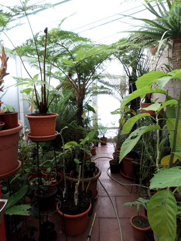 achteraan in een andere kas een paar grote boomvarens (2.00cm+) om te overwinteren, op de voorgrond een Draco ca 250cm