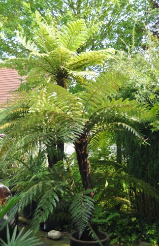 De regen met harde rukwinden leverde ondanks alle voorzorgen toch nog een verrassing op. Cyathea cunninghamii lag vanavond plat alhoewel deze met 3 kabels verankerd is. Na enig gepruts, de nylonkoorden moesten eerst worden losgemaakt, staat de varen nu weer overeind met een extra lijn. Het wordt hoog tijd dat deze knaap een nieuwe bestemming krijgt. Wellicht heeft er iemand een suggestie? Ik heb al contact gezocht met enkele beheerders van plantenzamelingen, Burgers, de Orchideeënhoeve en Hortus Amsterdam. Als er zich geen gegadigde aandient, is mijn laatste optie de Cyathea op te offeren met behoud van de lagere Dicksonia die er tegenaan groeit. Misschien dat hiervoor meer belangstelling is
