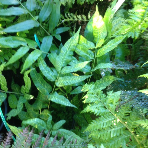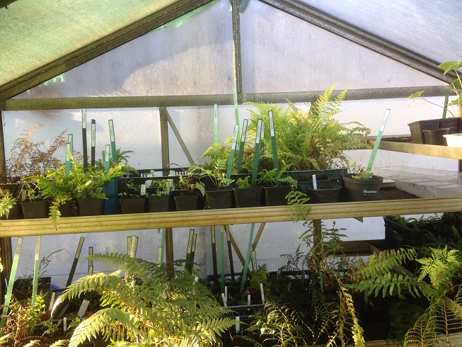 Een deel grotere boomvarens staan in de garage, andere varens boven op een kamer en hier in de serre: