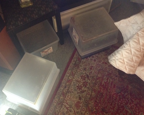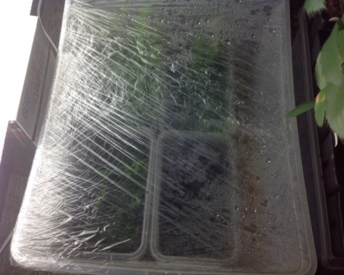 Na lang experimenteren -met vallen en opstaan- heb ik eindelijk de meest ideale vorm gevonden om jonge boomvarens uit sporen te laten groeien. Regel 1 -kun je wel stellen- is een zo hoog mogelijke luchtvochtigheid. Dat kun je bereiken door de zaaibakjes in een grotere bak te zetten en die met vershoudfolie te omwikkelen. Vocht kan zo niet verdampen. (Zie foto 1).