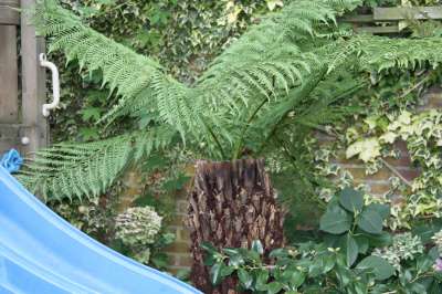 Dicksonia fibrosa met nieuwe veren, deze staat in kuip in de verhoogde border, helaas staat deze dit jaar in de volle zon dus veel water geven.