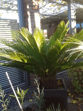 Hierbij de foto van onze Cycas revolata in pot, de stam is ongeveer 20 cm hoog, de grootste, nieuwste bladeren zijn intussen 1 jaar oud en de kleinere twee jaar, dit jaar heeft hij helaas niks gedaan maar ik heb begrepen dat ze weleens een jaartje overslaan.