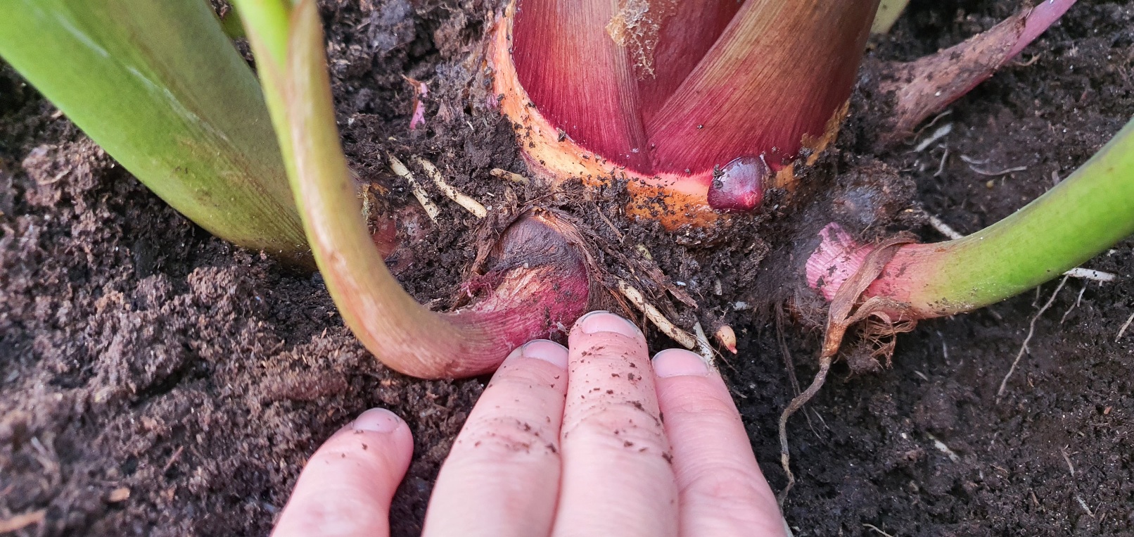 Zojuist het exemplaar die in de volle grond staat eruit gehaald. De knol is helemaal zompig dus dat wordt niet overwinteren als knol. Ik denk dat ik de rotte knol eraf snij en toch probeer op te potten. Beetje tegen beter weten in vrees ik.