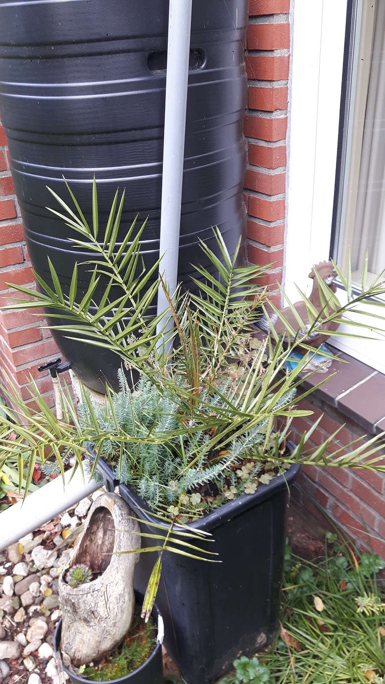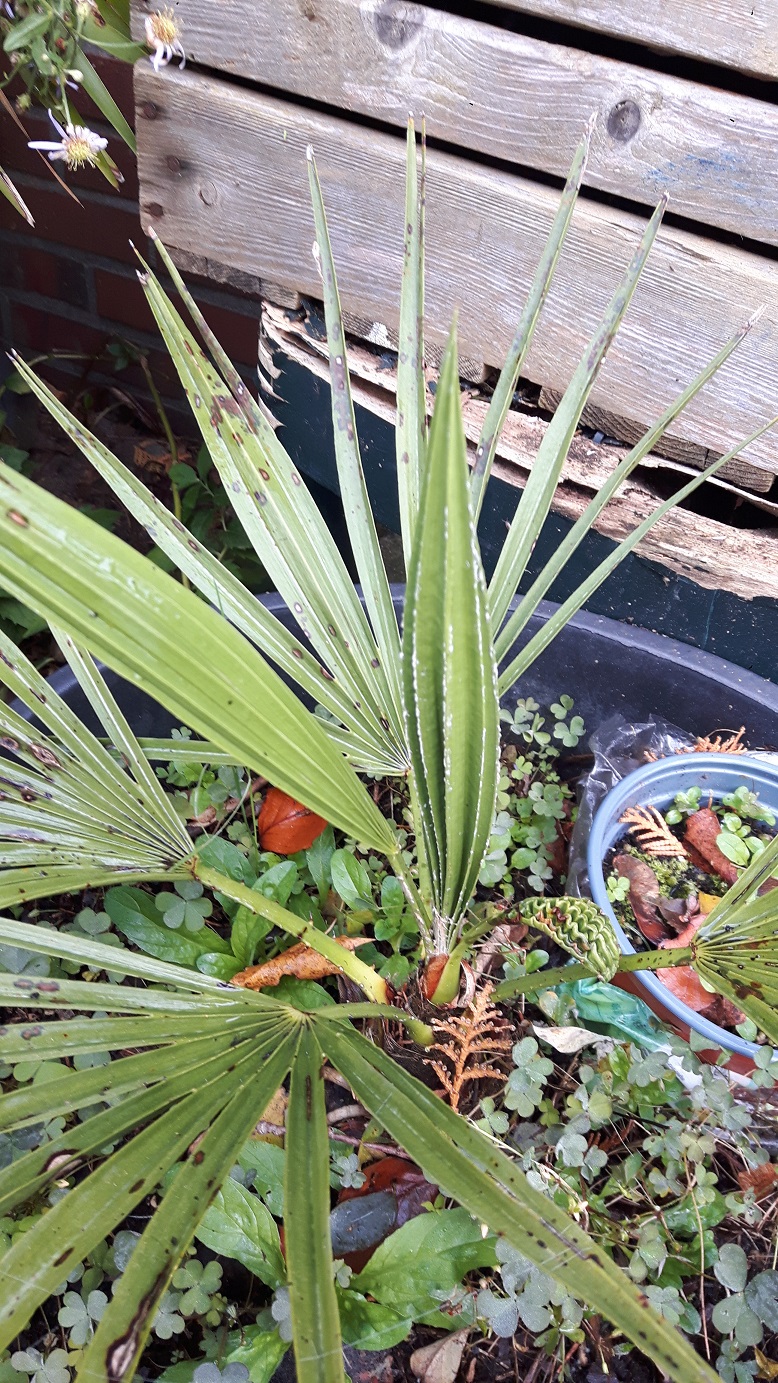 Hier gelukkig 2 voorbeelden van palm (zaailingen) die speerrot te boven komen, stonden de hele winter in de koude kas, waarschijnlijk iets te vaak de deur en raam dichtgehouden, waardoor te vochtig gebleken. Betreft de Phoenix D. en Brahea Armata.