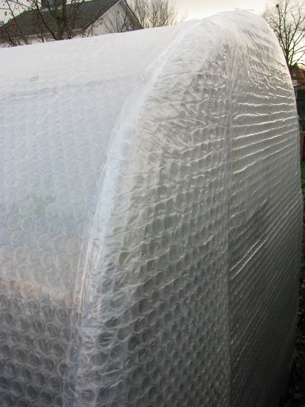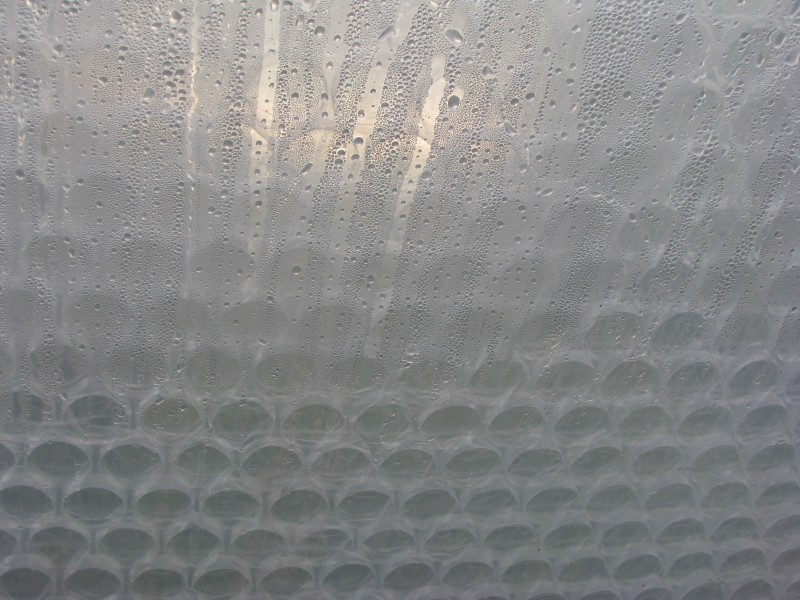 Verder ga ik ook folie met dikke noppen over de serre spannen. Dit isoleert maar laat nog voldoende licht door.