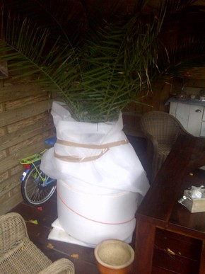 Mijn Canariensis verleden jaar zonder problemen overwintert in volle grond,eerst maak ik een houten geraamte errond,palen toch een 30 cm in de grond zetten zodat het geheel niet gaat vliegen met de soms hevige wind.Dan bind ik de veren toe met tape zodat de veren