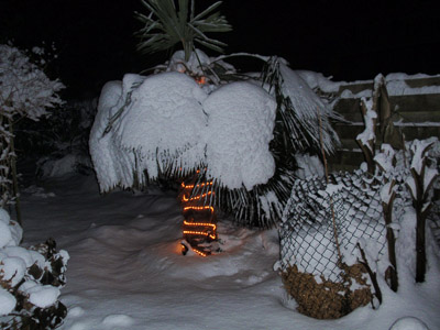 Ik wikkel de lichtslang (geen led) redelijk strak rond de stam van mijn grootste trachy en dan over de groeipunt heen zonder die te raken en schakel de verlichting alleen 's nachts in bij matige en strenge vorst. Dat gaat al jaren goed. Hieronder een foto uit 2009, de palm is inmiddels een meter hoger.