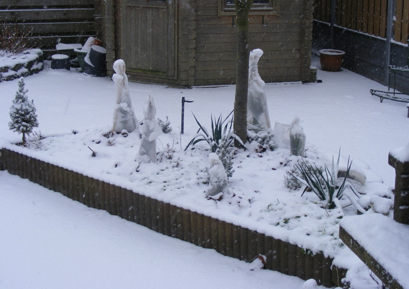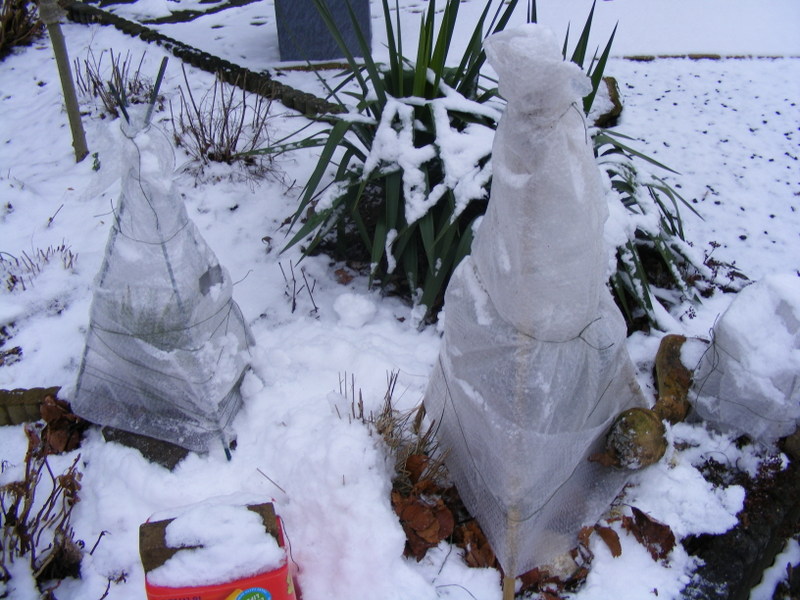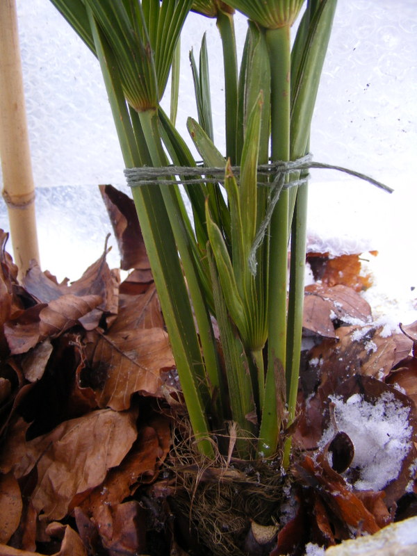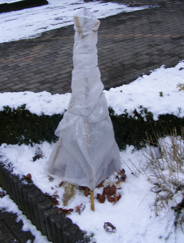 Vandaag ook even foto's gemaakt van mijn winterbescherming. Tot nu toe valt het mij heel erg mee hoe de palmen er buiten in de volle grond uit zien. Bij vorige sneeuw wat ook rond het 0 graden was zagen de palmen er slechter uit en dat was nog met minder vorst. Toen heb ik ook geen bescherming geplaatst.