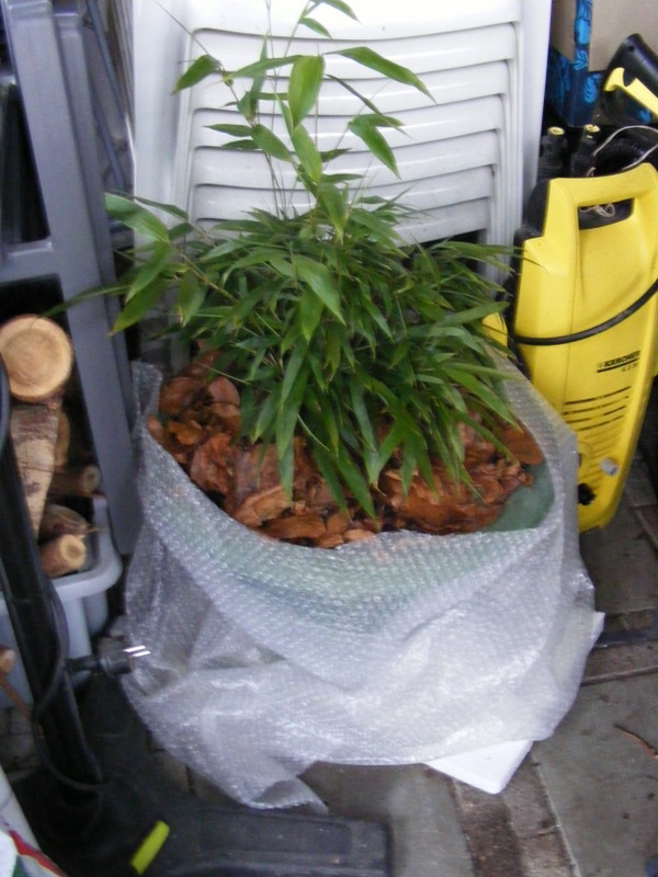 Phyllostachys aureosulcata “Aureocaulus staat in het tuinhuis waar het ook stevig kan kraken. Bescherming door blad op de bodem, noppenfolie om de pot en piepschuinplaat tegen de kou van de grond. Geen verkleuring of blad afval tot nu toe!