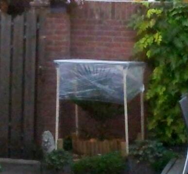 Een bigbag waar ik onderin een gat maak, trek ik over de stammen. Hierin doe ik nog een laag paardenmest. Hierop komt de snoeiafval van mijn hagen.