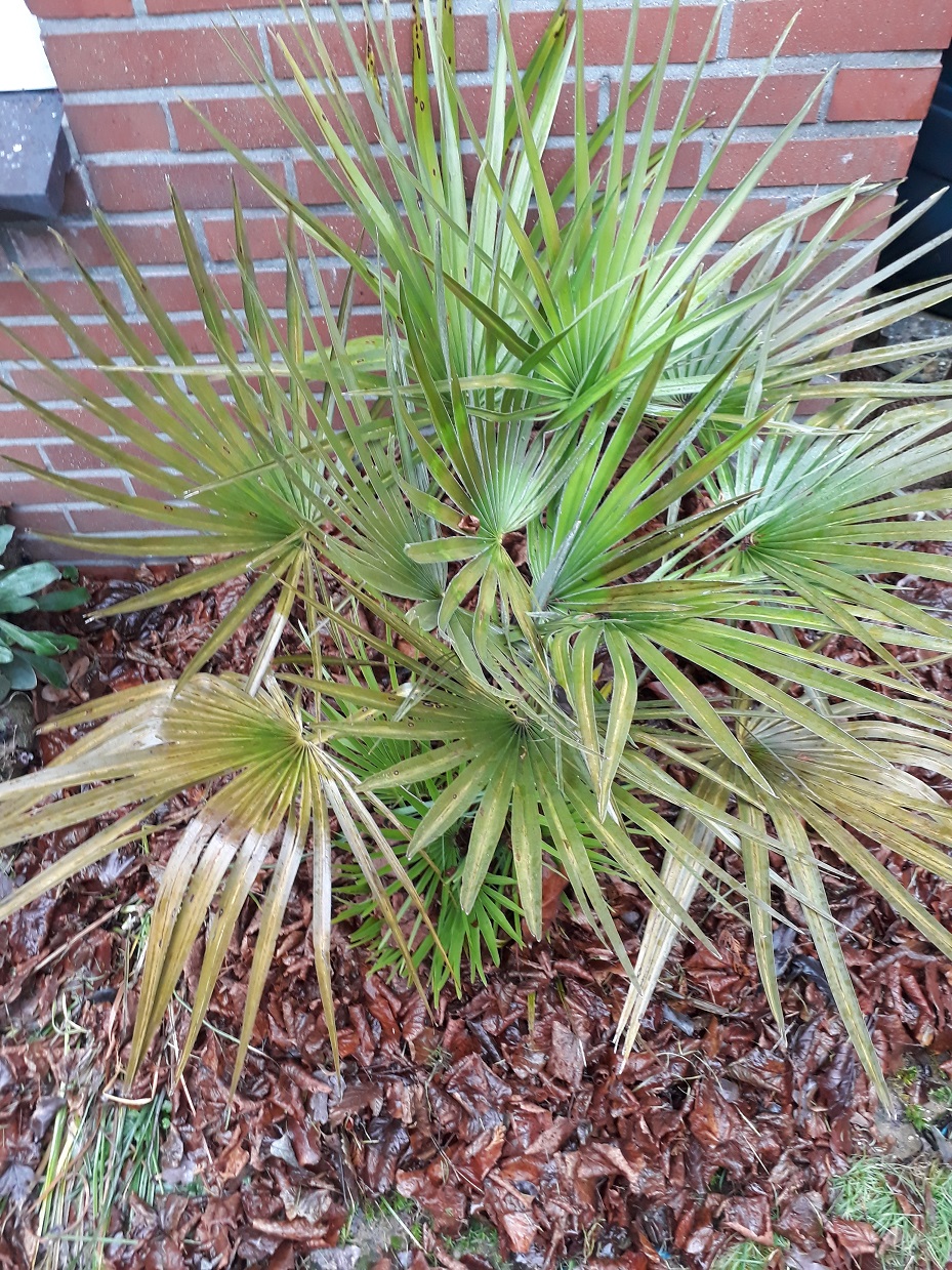 Alles intussen maar weer uitgepakt en vandaag de laatste van bladbulten ontdaan. Een aantal Chamaeropsen lijkt wat lichte bladschade te hebben op plekken waar het blad tegen de plu/kuip aan zat jammer genoeg. De twee grote met vliesmutsen bij de gevels niet. Maar wat me meer verraste, was dat de Chamaerops onder de bult bladeren al direct bevroren blad liet zien tijdens de vorstweek. Dat verraste me omdat deze plant in kuip al twee winters hier heeft gestaan en vorst heeft gezien, zonder zichtbaar effect.