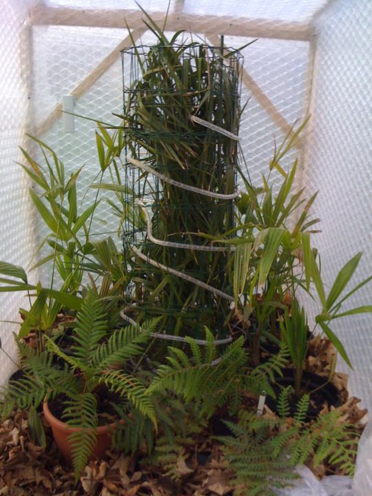 1m grondoppervlak x 2 m hoog. Zou dienen om de Wasingtonia te beschermen. De grond is tot de volledige stamhoogte (40 cm) bedekt met bladeren en hakseling en rond de samengebonden bladeren zitten 2 stevige lagen vliesdoek, daarrond 5 bamboestokken en over de top een bigbag tegen de regen. tussen de bamboestokken en de vliesdoek zou ik een bekaertdraad rond de plant zetten en daar zou ik de lichtslang tussen weven. Die zou ik met een thermostaat laten branden tussen 2° en 5°.