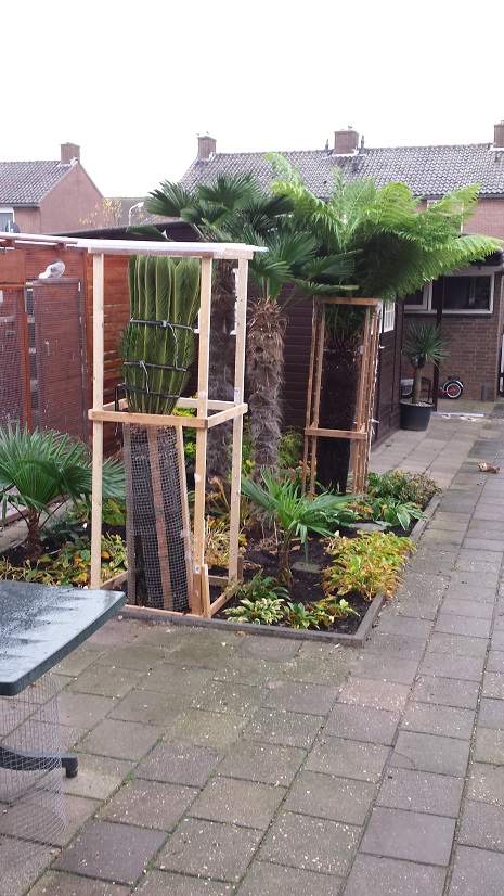 bij de cycas gekozen voor gaas om de stam (met een panlat ertussen voor de afstand) om de warmte kabel makkelijk op te kunnen bevestigen. blad opgebonden en geraamte van panlatten omheen gezet met een golfplaatje bovenop. warmtekabel er omheen gedraaid met ongeveer 10 cm afstand tussen de lussen en dicht geniet met bubbeltjes folie. aan 1 kant een strook van zeg 20 cm aan de bovenkant open gelaten voor de frisse lucht, betreft straks enkel thermostaat plaatsen en hokje dichten.