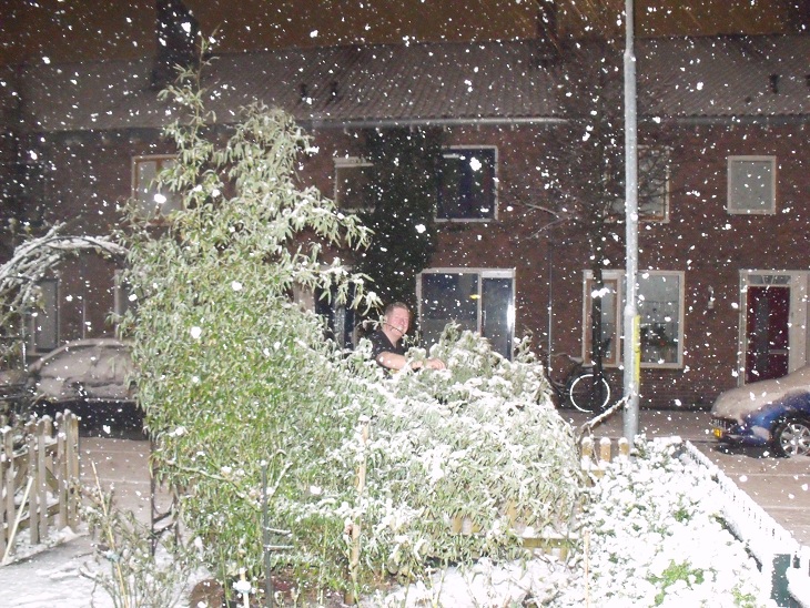 hallo palmvrienden,zoals bekend is januarie nog te vroeg om een totale schade raport te maken over de totale winter,maar er staat ook schade raport januari,en die is al voorbij,en helaas kwam de winter weer terug,dit keer was niet de vorst de boosdoener ,maar de natte sneeuw die vanacht in hevigheid viel,het gewicht is enorm,was om 2 uur in de nacht nog in de weer de bamboes te redden,dit ook omdat het over de straat ging hangen en de doorgang zou kunnen belemeren,maar de sneeuw bleef vallen en de temp ging hier verder onderuit tot onder 0,vanmorgen met heerlijk zonnetje erbij was die aan de straatkant weer helemaal ontdooid en mooi overend gekomen,maar die in de achtertuin heeft een stengel het op moeten geven,het is een dikwandige bamboe die toch heel wat kan hebben,maar gebukt ging door het zware gewicht het lootje moest leggen, droge sneeuw is geen probleem,maar die vervelende natte plaksneeuw dat veel water bezit is erg zwaar,zo zie je maar weer,schade kan in de winter uit een hele andere hoek komen,en ook onverwachts,zie de foto`s ,m,v,g, paul
