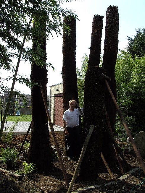 Gewoon een korf rond de boomvaren tot 40cm (of meer) boven de kop en alles vullen met haksel. Het geeft niet welk haksel berk, deen of van het containerpark.
