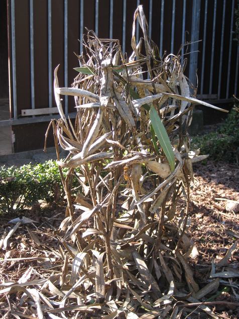 Ik vrees toch het ergste voor deze oleander, ziet er niet goed uit. Enkele jaren terug heb ik het ook eens geprobeerd met een gewone oleander, en die heeft het nipt overleefd. Ik heb hem toen terug uitgegraven en opgepot.