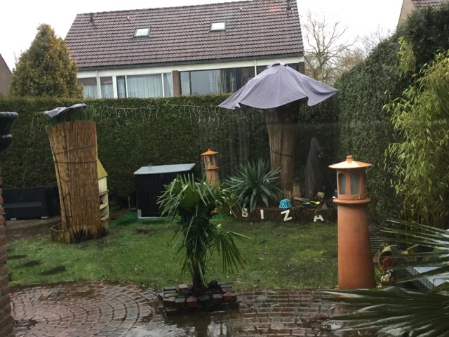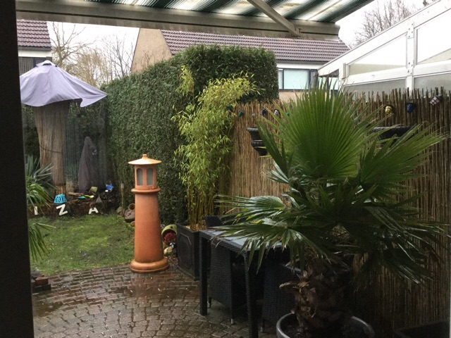 Als het goed is komt er vanavond weer een lading sneeuw aan en heb vanmiddag maar een oplossing bedacht voor dit probleem. Rieten matten om de stam binden (lijkt trouwens eenvoudiger dan dat het is) en op de kop een paraplu/parasol. Helpt ook een klein beetje tegen veel regenval.