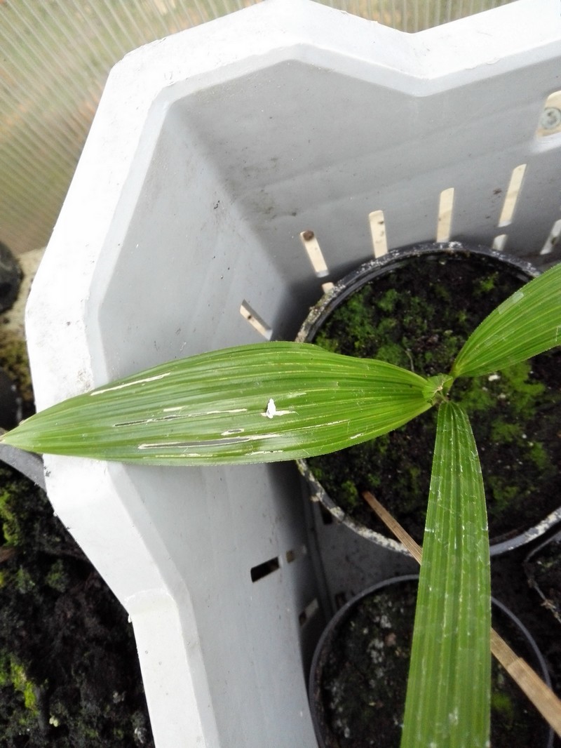 Mijn palmpjes staan buiten in een kas. Ze zijn net een jaar oud, maar ik merk nu t soms wat afkoelt s'nachts dat de bladeren beginnen in te scheuren. In t begin was het bij de jongste palmpjes maar nu ook bij de gene die ik iets langer heb.