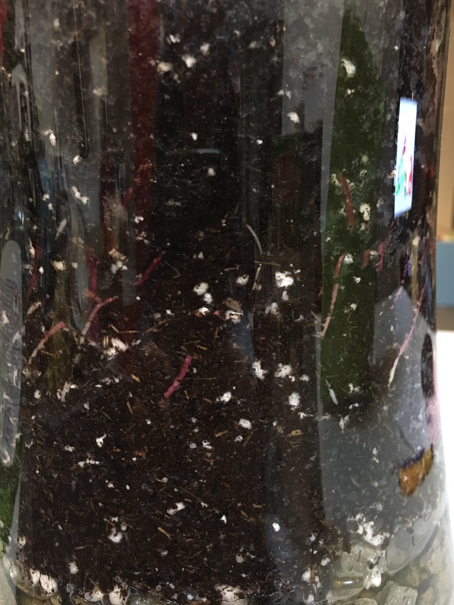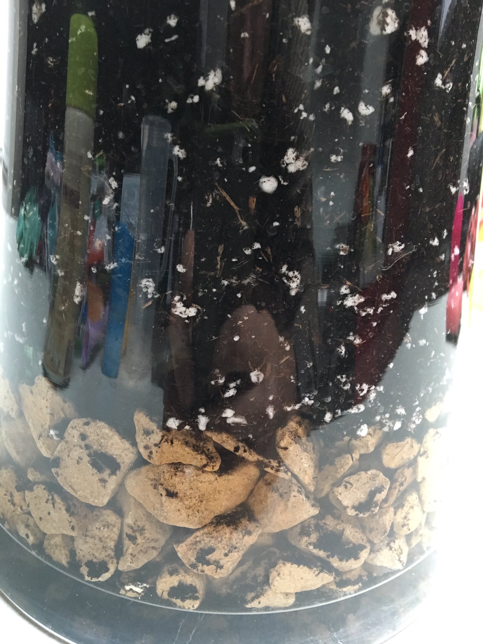 Vaas gevuld met 15 cm. grind, daarin een klein flesje met afgesneden bodem en opgevuld rond de fles en in pot een mengsel van potgrond en perliet.