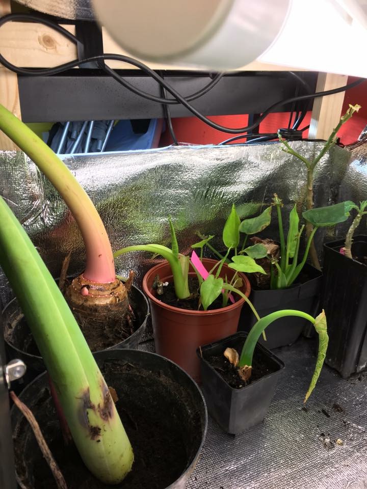 Hier staan er een aantal gewoon op de vensterbank bij 20 a 22 graden. Gaat prima. Ik heb hier binnen nu Colocasia fallax uit Nrepal en C. illustris uit Java. Verder Colocasia Diamond Head, een hele mooie. Diverse jonge plantjes ook.