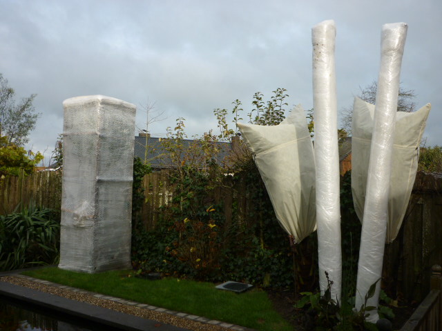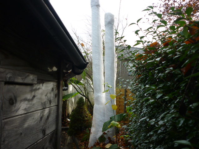 dit jaar geen tentjes rond de palmen maar zakken speciaal voor planten eens proberen (gaat wil veel sneller) ik heb dit jaar ook pvc buizen van dia 16cm omwikkeld met eerst schuimfolie enkele lagen daarna met nopen folie en daarna met winkelfolie om alles samen te houden zijn nu afgewerkt 26 cm dik ,dus toch rondom 5cm bescherming. de bladeren van de bananenboom en er gewoon laten overglijden is er ook vlug op en af in het voor jaar moest het plots terug nachtvorst zijn. :thumb_up: