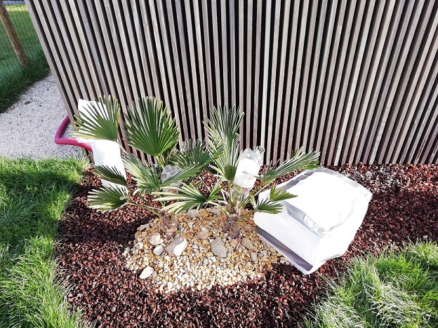 Dit ter bescherming van een cordyline, twee cactussen (die in theorie tot -15 kunnen) en een gouden lotus banaan (opgevuld met stro). De Trachycarpus Wagnerianus hebben een pet fles over hun speer gekregen. Deze nacht hadden we de eerste vorst. Het zal volgende week terug warmer worden, dan kunnen ze er terug af. Beter eerst op voorhand proberen dan plots voor een voldongen feit te staan