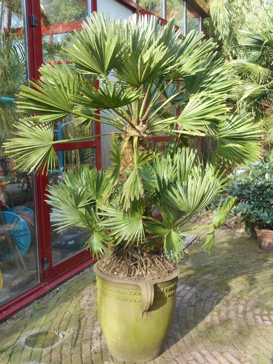 Vandaag heb alvast een aantal overwinteraars uit de kas in het zonnetje gezet. Zonodig staan ze snel weer binnen. Het meerendeel van de grote palmen houd ik voorlopig nog binnen. O.a. Chamaedorea elegans heeft de koude test weer glansrijk doorstaan. De temperatuur tipte geregeld aan het vriespunt. De varens staan er ook uitstekend bij en lopen al volop uit. Tot slot een foto van Trachycarpus martianus 'Khasia Hills', wat mij de betreft heeft deze de mooiste bladvorm van het geslacht.