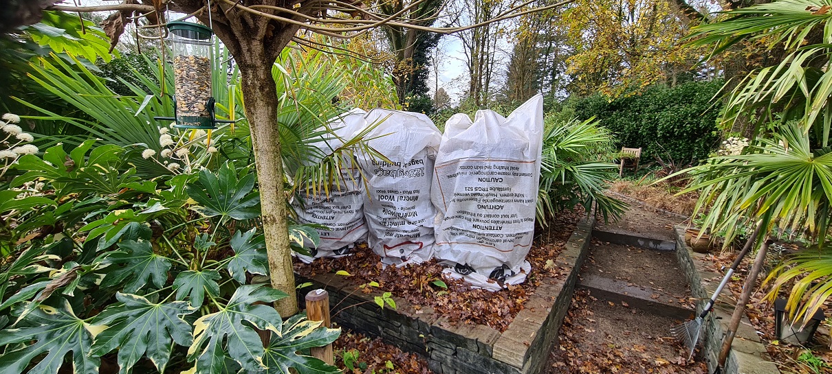 - Kooi vullen met isolatiemateriaal tot aan de rand. Ik gebruik sowieso eerst alle bladafval van de banaan hiervoor, evenals snoeiafval van Canna, Tetrapanax en Hedichium. Aanvullen met eikenblad, stro of een ander materiaal dat voorhanden is. Er gaat vrij veel in, en eea nag best stevig worden aangeduwd, want eea klinkt echt wel iets in gedurende de winter!