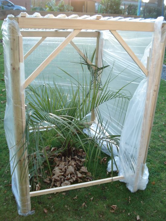 gisteren even van het goede weer geprofiteerd om al een afdakje boven de butia eriospatha te maken , al het gaat vriezen ga ik de bladeren een beetje samen binden vliesdoek rond de stam en huisje inpakken met noppenfolie ga er ook nog een lichtslang in voorzien voor als het echt hard gaat vriezen .