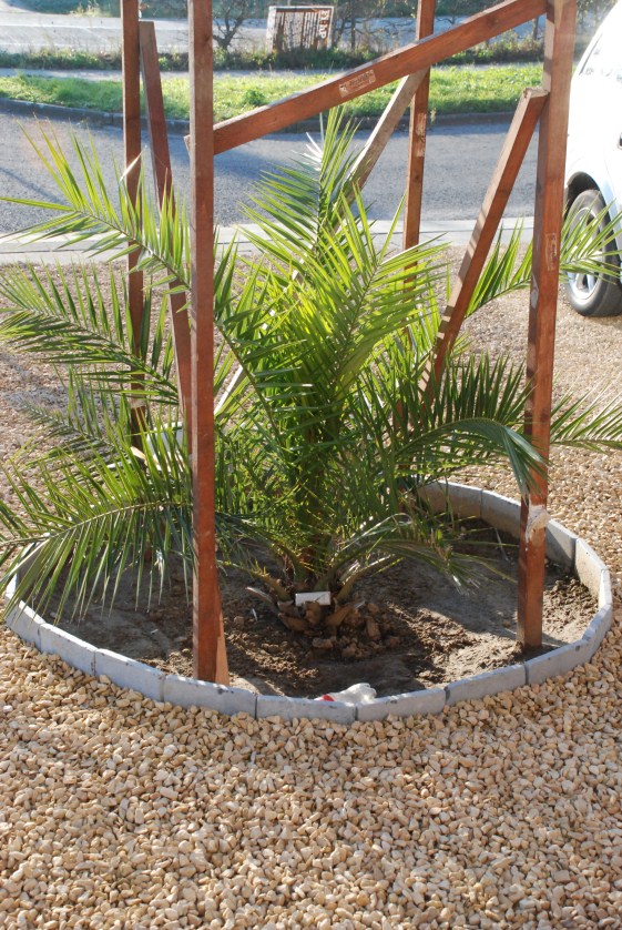 Mijn Canariensis verleden jaar zonder problemen overwintert in volle grond,eerst maak ik een houten geraamte errond,palen toch een 30 cm in de grond zetten zodat het geheel niet gaat vliegen met de soms hevige wind.Dan bind ik de veren toe met tape zodat de veren