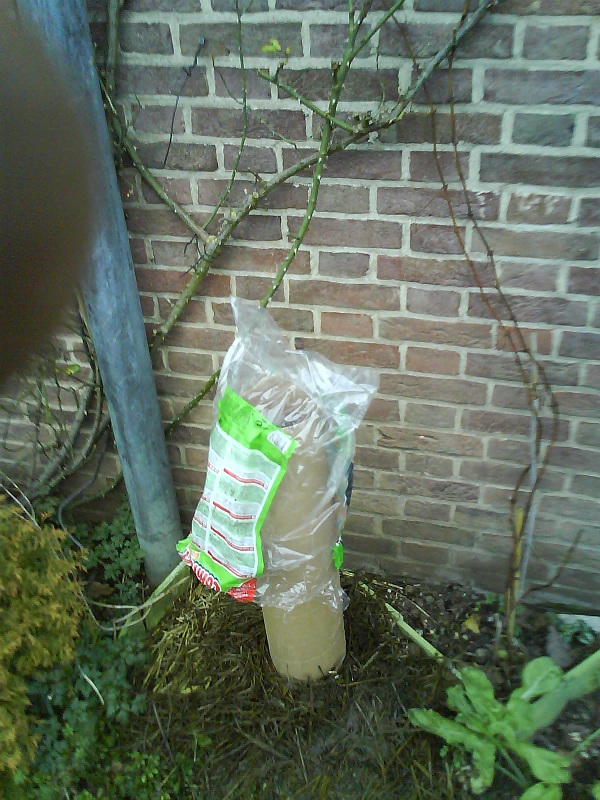 Eerst had ik een plastic bakje over het plantje gelegd. Toen een berg stro erover en daarna de dakpannen. Staat ook redelijk dichtbij de zuidmuur.