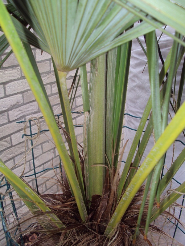 Heb hier een kleine Trachy Fort. Nainital dicht tegen het huis staan (1 meter afstand), aan de voet bedekt met 20 cm houtsnippers en rond de bladeren en stammetje een dubbele laag vliesdoek en die doet het schitterend : niet de minste schade en dezelfde staat 10 meter verder op de hoek van mijn oprit, met dezelfde bescherming en die vertoont serieus wat bladschade. Gelukkig zien de 2 speren er nog goed uit.