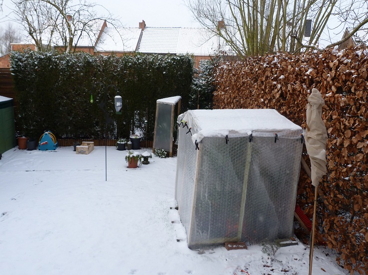 ja droog staat hij onder een afdak en op de grond een dikke laag cacao doppen als isolatie als het harder gaat vriesen kan ik het scherm van noppenfolie laten zakken