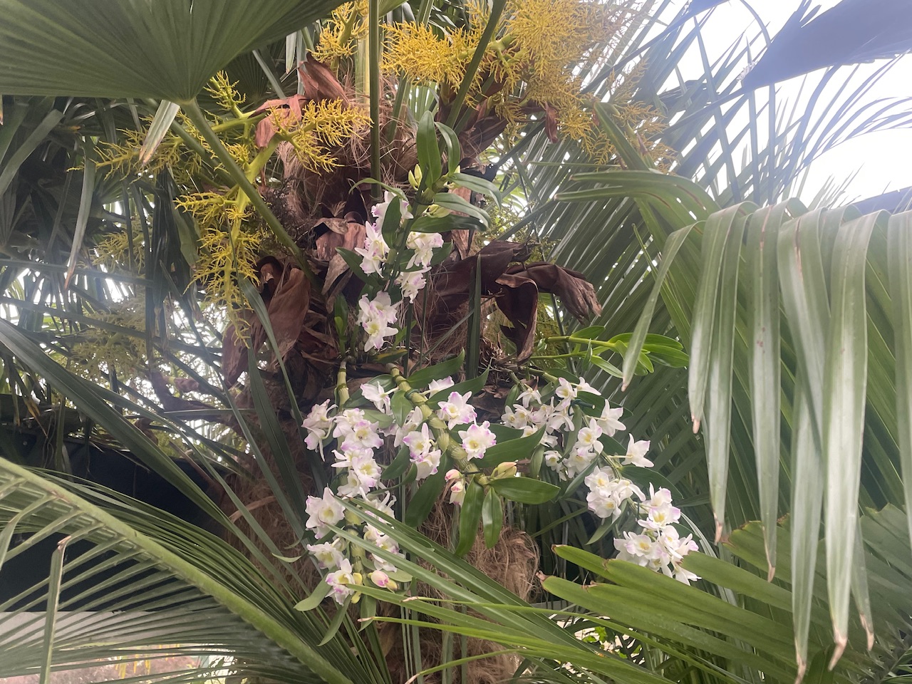 Ik heb deze dendrobiums vastgemaakt in de holtes tussen de bladstelen en de oude bloei gebruikt om de kluit te steunen. Hopelijk gaan ze op de stam wortelen.