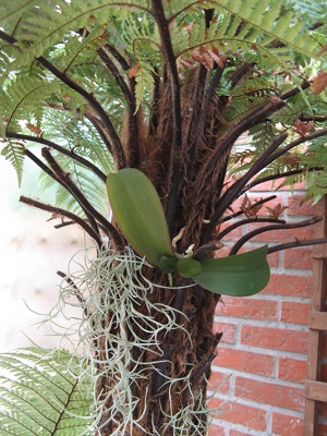 komt om te overwinteren in de veranda en half mei terug naar buiten gaat op een beschermde plaats.Nu had ik ook een kleine phalaenopsis en kwam ik op het idee om die aan de stam te hangen zodat hij zich met zijn wortels kan vastzetten tussen de oude stelen van de boomvaren en zo kan verder groeien .De temperatuur in de veranda hou ik boven de 6 graden .Water krijgt de phal. als ik de boomvaren water geef in de kop en op de stam .Wat denken jullie hiervan ? Zou de phalaenopsis op deze manier kunnen groot kunnen worden en uiteindelijk bloeien en zou de dicksonoia squarossa niet te veel afzien van die wortels of verstikt worden door de wortels ?