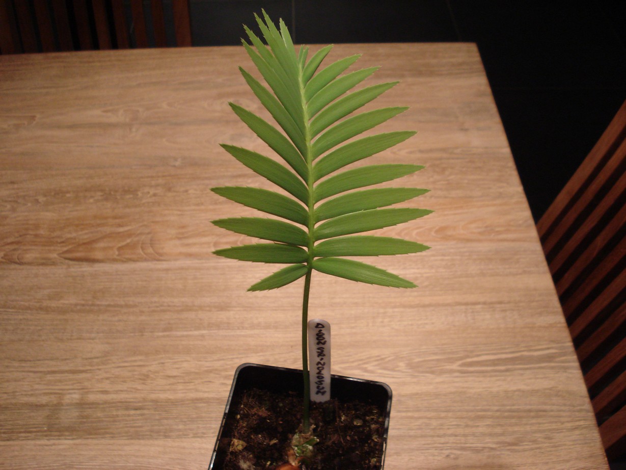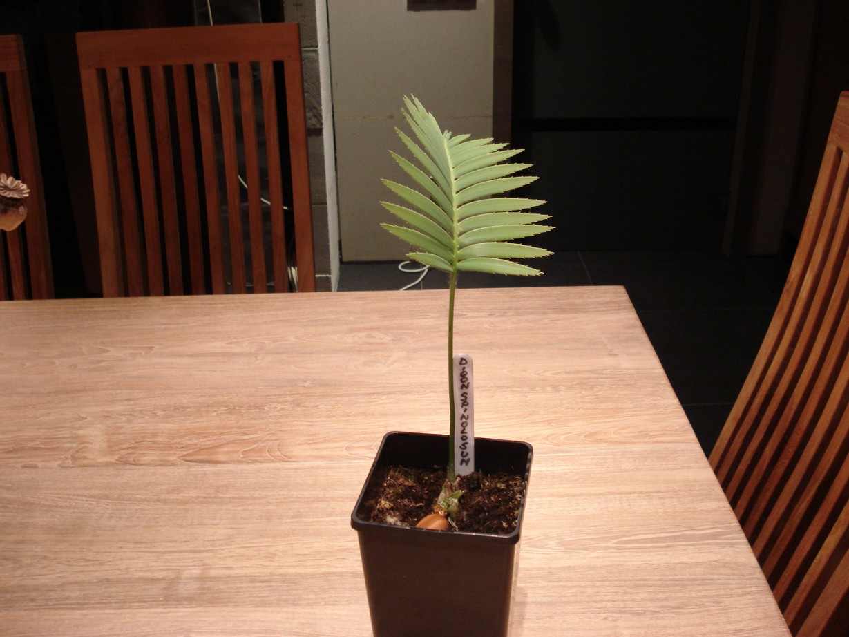Hier enkele foto's van mijn zelf gezaaide Dioon spinolosum. Het was de tweede poging met deze soort. De eerste keer te natte zaaigrond, 3 stuks gerot. Bij de tweede keer waren 2 van de 3 zaden geplet tijdens de verzending, één zaad van deze laatste batch heeft het dus gehaald en zijn eerste blad aangemaakt. Gezaaid op 1 maart 2011 - Eerste opgerolde blad in juli - En nu einde oktober het eerste ontrolde blad, het moet wel nog een heel eind groeien. Staat in Asef mediterrane potgrond, zoals trouwens praktisch al mijn "kweeksels".