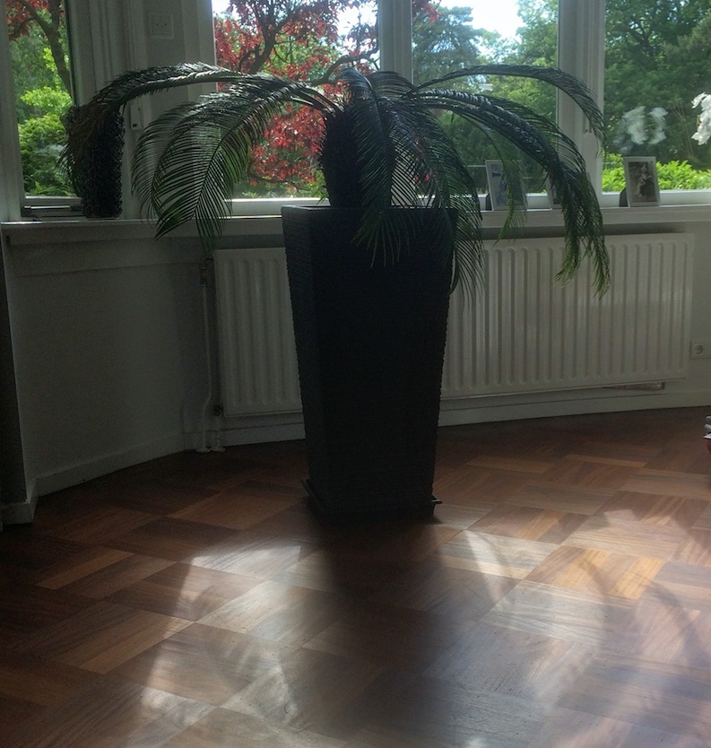 Ik zie wel dat ie in een dichte pot staat. Zit er een binnenpot in? Weet je zeker dat ie niet te nat of droog staat? Op langer termijn gaat deze constructie een probleem vormen, binnen of buiten. Ik zou overwegen om voor een andere constructie te kiezen.