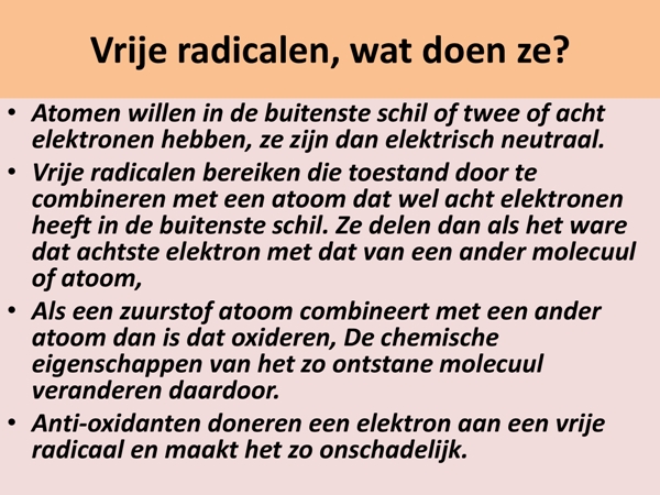 Het is scheikunde maar het wordt eenvoudig uitgelegd dus wellicht dat de meesten het wel begrijpen. Ter sprake komen de vrije radicalen, de bron van alle ellende. Vrije radicalen zijn agressieve zuurstofatomen die zich verbinden met andere atomen. Dat proces is oxidatie. Vindt plaats in de natuur, maar ook in uw lichaam. Het is belangrijk voor een lang en gezond leven om dat zoveel mogelijk te beperken en daar helpen anti oxidanten bij. Wie wil er nu niet gezond leven?