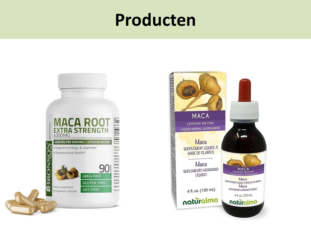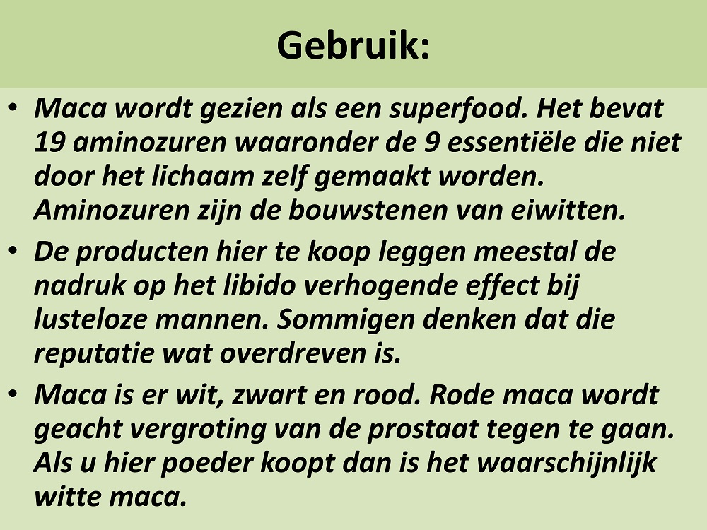 De witte, of gele Maca wordt gezien als vrouwenmaca. De zwarte als mannenmaca. De rode is dus goed voor de prostaat.