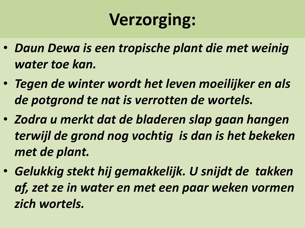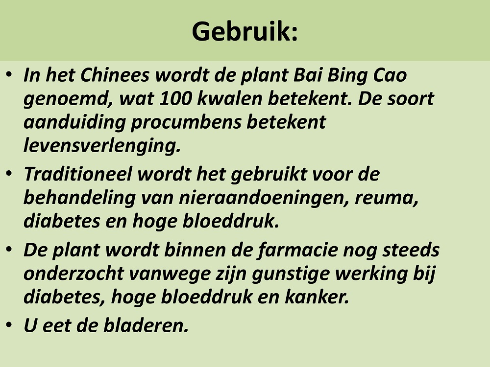 Zoals de naam al zegt, 'Plant van God' geeft aan dat er in Azië veel waarde wordt toegekend aan de medicinale eigenschappen van deze plant. De Chinese benaming, Bai Bing Cao, 100 kwalen, wijst daar ook op. Vooral bij Diabetes type 2, de ouderdomsdiabetes, wordt deze plant aanbevolen. Dagelijks enkele bladeren eten is het recept. Er wordt veel wetenschappelijk onderzoek gedaan naar de mogelijkheden en de eigenschappen van Gynura. In de zomer is het geen probleem om de plant in leven te houden, hij groeit uitbundig. Naarmate de herfst komt en de winter nadert wordt het anders. De plant is een tropische min of meer succulente plant en moet als het weer somberder wordt vrij droog gehouden worden. Natte grond leidt onherroepelijk tot het afsterven van de wortels. De bladeren verbleken en gaan slap hangen. Je kan dan maar één ding doen, alle stengels afknippen en in water zetten. Daar wortelen ze gemakkelijk en je hebt weer een plant. Droog en zo licht en warm mogelijk is het beste om de plant over te houden, maar het blijft lastig. Maak in de zomer zoveel mogelijk stekken om het onvermijdelijke verlies in de winter te compenseren.