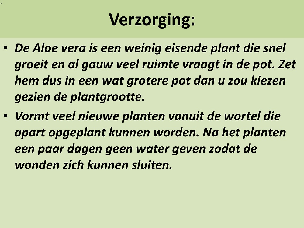 Het recept voor een gezonde Aloe plant is verwaarlozing. Laat hem maar rustig een beetje verdrogen. Aloe houdt van warm en zonnig.