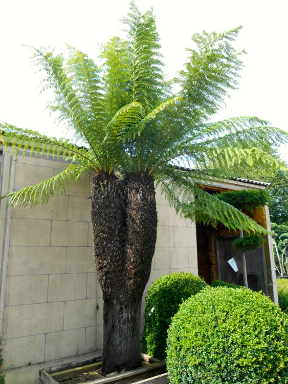Bijgevoegd zijn een paar foto's van in het oog springende planten, een Dicksonia die halfweg de stam in drieën vertakt en een bonsaibak met Trachycarpus fortunei.