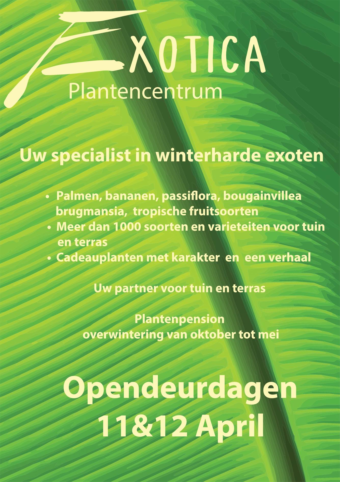 Aangezien ik er meteen ben ingevlogen na de overname is de winkel nooit gesloten geweest, maar toch wilde ik iets doen om dit nieuwe hoofdstuk in de verf te zetten. Daarom nodig ik iedereen van harte uit op onze opendeurdagen, waar we onder ons nieuwe motto - “Want elke tuin verdient iets extra”- met een hapje en een drankje Exotica 2.0 lanceren.