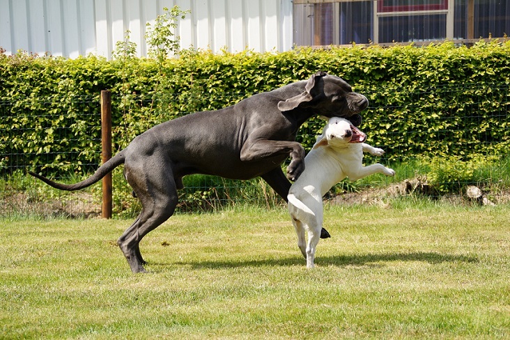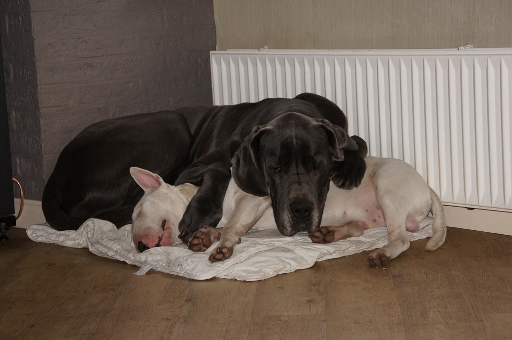 Ik zag dat Luc ook een Duitse dog heeft. Hier loopt er ook zo'n grote lieve jongen van zo'n 85kg, en een fantastische waakhond. We hebben ook een geweldige Bullterrier, de clown hier!