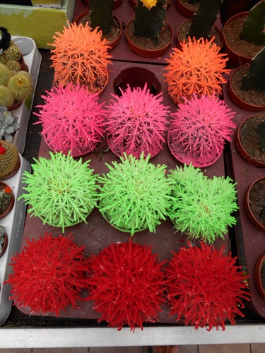 Wat mij betreft is het een lichte vorm van heiligschennis om planten te verven, te beplakken met oogjes of te versieren met ballen, hoedjes, pieken en andere ongein