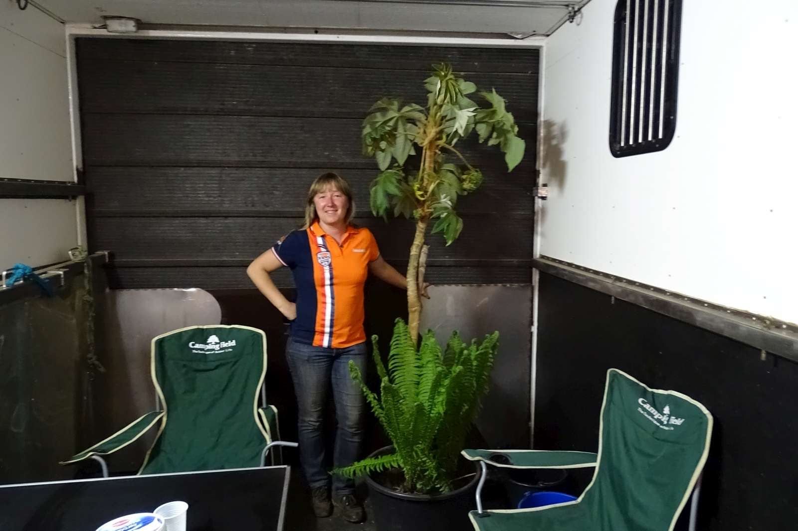 Zo gezegd zo gedaan. Ik werdt door mijn vriendje op de scooter bij de weg af gezet en daar hoefde ik maar even te wachten tot Herman er was. Vrolijk in de auto gestapt bij een wildvreemde man ha ha en op naar de tetrapenax. Deze had Herman er snel uit en samen met 2 mooie varens werdt alles in de auto gestopt. De stam was zo mooi lang dat ik niet eens meer voorin de auto paste. Dus als een prinsesje achter in en op naar het wedstrijd terrein. Hier was het zo stoffig dat ik Hermans mooie auto er niet aan durfde te wagen, dus...... kwam mijn vriendje met de kruiwagen EN de ruilhandel naar de weg gelopen. Met de prachtige plant in de kruiwagen moesten we het hele terrein over, tot grote hilariteit en nieuwschierigheid. Want hij viel wel op tussen alle koetsen en paarden. Het enige nadeel was dat we nog 3 dagen bivakeerden en in Horst en dus heb ik liters water bij de bak in gedaan om hem maar in leven te houden. Zoals te zien op de foto's had de plant er absoluut heen probleem mee om op de camping te staan.