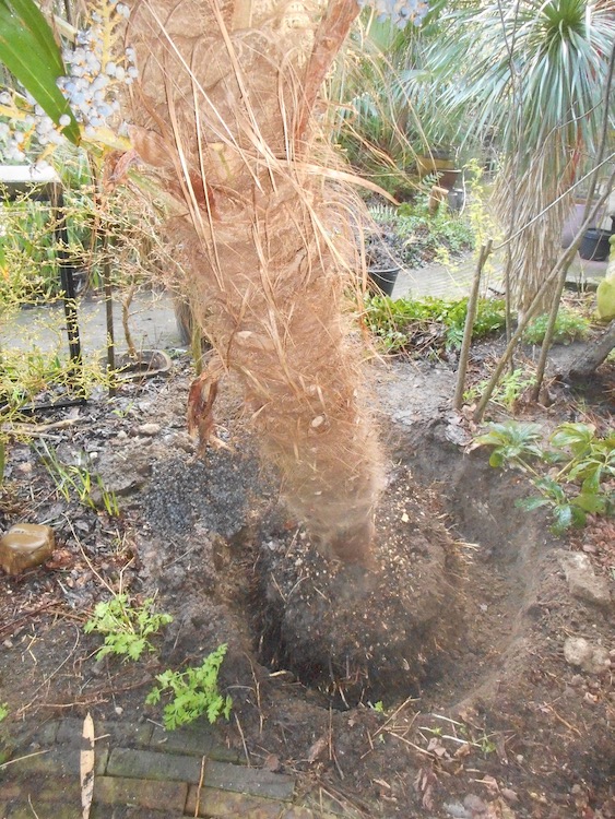 De plek waar deze palm is neergezet blijkt achteraf niet handig -dicht bij de gevel. Dat is gedaan na de slachting van de winter 2012. Of de gisteren uitgegraven palm het gaat redden is een flinke gok. Ruimte om een grotere kluit te isoleren is er niet vanwege de omringende Acers die al beginnen uit te lopen.