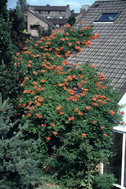 draco schreef:Als je hekel hebt aan terracotta is deze klimmer misschien minder geschikt, alhoewel Campsis radicans 'Madame Galen' goed bestand is tegen zon en warmte. Campsis behoort tot dezelfde familie als Podranea en Pandorea die in Nederland helaas niet winterhard zijn. In principe is Campsis zelfhechtend. Een nadelige eigenschap is wel dat de ranken onder dakpannen kropen waardoor ik jaarlijks het dak op moest voor een uitgebreide snoeibeurt.