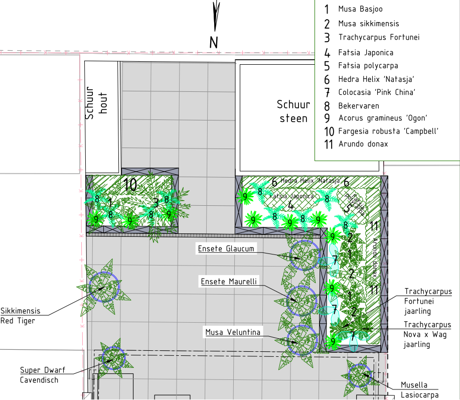 hi Bas, ik denk dat een belangrijk doel van de opzet is om de muren schuttingen zo groen mogelijk te houden. Daar kan ik niet over adviseren. Ik zou persoonlijk meer gebruik maken van het feit dat je in vlissingen woont, ongeveer de minst koude plek van NL. Een butia, agave, chamaerops of iets dergelijks zou ik zeker overwegen. De huidige opzet is, zeker in de winter zonder de bananenbladeren, een winterharde groene tuin zoals je ook in koudere delen van NL ziet.